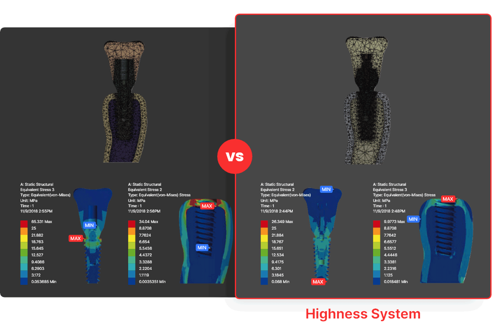 Experimental results show that vertical and lateral forces cause critical loading on the marginal bone in conventional prosthetics, leading to bone loss. However, the “Highness System” demonstrates significantly superior stress distribution compared to conventional prosthetics.