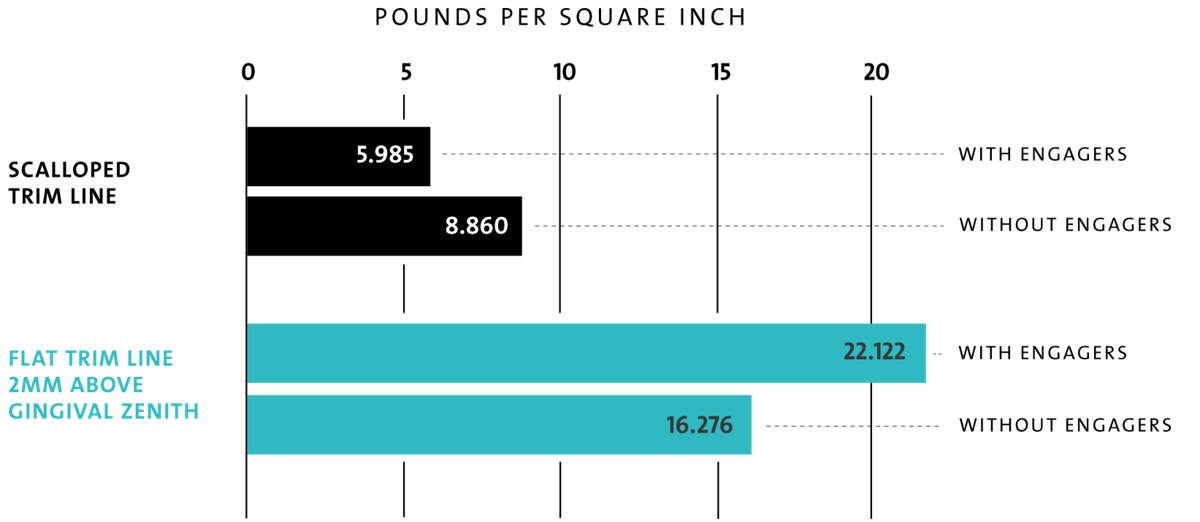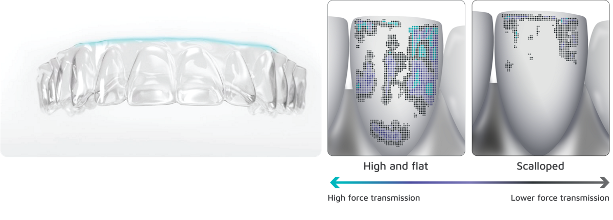 Extending beyond the gingival margin, the high and flat trimline has been clinically proven to optimize force transmission for more accurate tooth movement and enhanced root control.4 It’s also proven to be 2.5x more retentive than scalloped aligners, which reduces the need for retentive engagers.