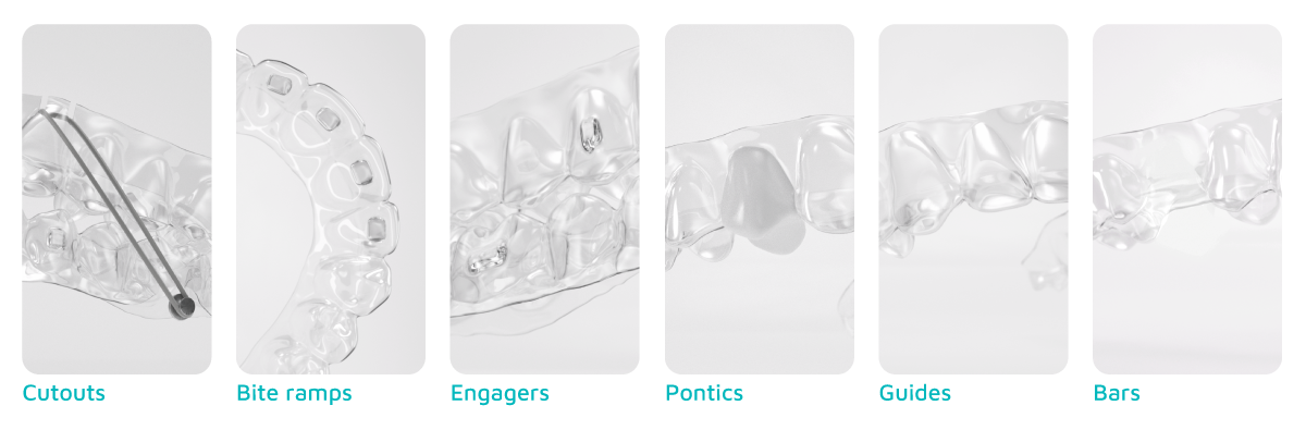 Our clinical features have been optimized to tailor your patient’s treatment precisely to their needs: from customizable engagers, to bite ramps, to cutouts for elastics, to pontics, bars, and guides, clinicians can incorporate any number of treatment strategies to address cases ranging from simple to complex.